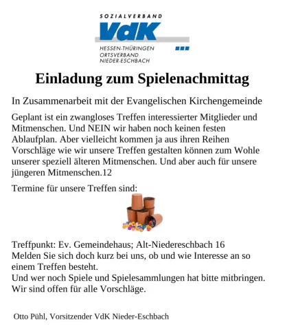 Geplant ist ein zwangloses Treffen interessierter Mitglieder und Mitmenschen. Und NEIN wir haben noch keinen festen Ablaufplan. Aber vielleicht kommen ja aus ihren Reihen Vorschläge wie wir unsere Treffen gestalten können zum Wohle unserer speziell älteren Mitmenschen. Und aber auch für unsere jüngeren Mitmenschen.
