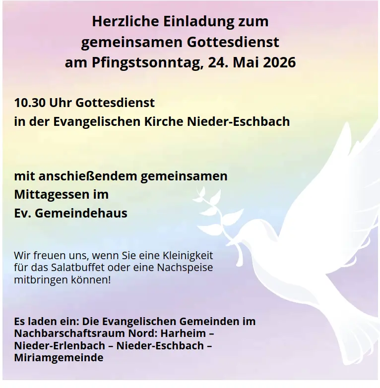Im Anschluß an den gemeinsamen Pfingstgottesdienst findet ein gemeinsames Mittagessen im Gemeindesaal der Evangelischen Kirchengemeinde Nieder-Eschbach statt.