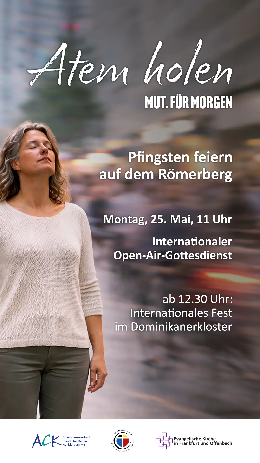 „Atem holen. Mut für Morgen“ lautet das Motto des internationalen Pfingstfestes, das am Pfingstmontag, 25. Mai 2026, in der Frankfurter Innenstadt gefeiert wird. Begonnen wird um 11 Uhr auf dem Römerberg mit dem traditionellen Open-Air-Gottesdienst. Das Evangelische Stadtdekanat Frankfurt und Offenbach, der Internationale Konvent christlicher Gemeinden Rhein-Main und die Arbeitsgemeinschaft Christlicher Kirchen (ACK) Frankfurt laden dazu ein. Der evangelische Stadtdekan von Frankfurt und Offenbach, Holger Kamlah, wird die Predigt halten. Dekanatskantor Simon Graeber mit Band und die Frankfurter Bläserschule gestalten den musikalischen Rahmen. Kindern wird ein Begleitprogramm angeboten. Talks und Musik sorgen für Einstimmung auf den Gottesdienst.